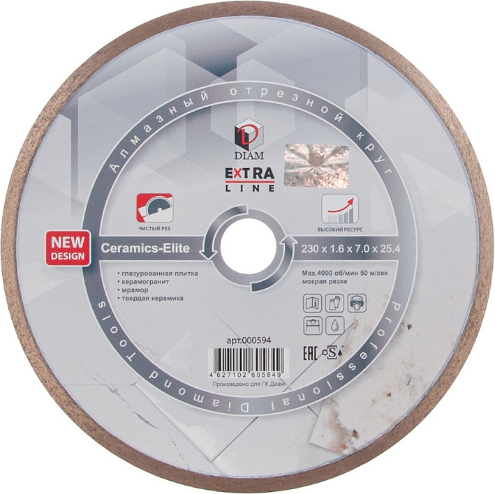 Алмазный отрезной круг Diam Extra Line 1A1R Корона Ceramics-Elite 230 мм (Диам Экстра Лайн 1А1Р Корона Керамикс-Элит 230 мм) – специальный алмазный круг со сплошной режущей кромкой для мокрой резки глазурованной плитки, твердой керамики, керамогранита, мрамора и аналогичных по своим характеристикам материалов на болгарках (ушм), штроборезах, бензорезах, электрических резчиках и плиткорезах, стенорезных машинах с подачей воды.