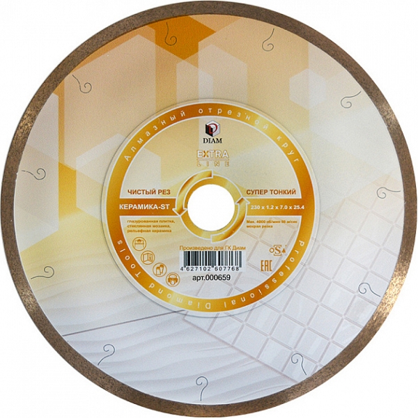 Алмазный отрезной круг Diam Extra Line 1A1R Корона Керамика-ST 230 мм (Диам Экстра Лайн 1А1Р Корона Керамика-СТ 230 мм) специально разработан для качественной резки глазурованной плитки, керамической и стеклянной мозаики, 3-D керамики, керамогранита с рельефной поверхностью на электрических станках и плиткорезах с водяным охлаждением. Идеальный алмазный диск для работы с отделочными материалами на основе керамики, стеклянной мозаикой, лейкосапфиром.