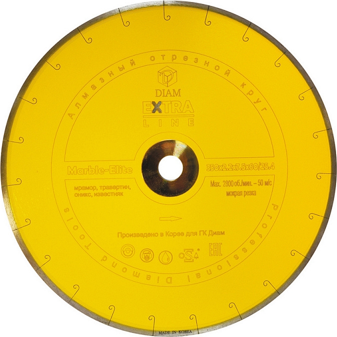 Алмазный отрезной круг Diam Extra Line 1A1R Корона Marble-Elite 350 мм (Диам Экстра Лайн 1А1Р Корона Марбл-Элит 350 мм) – профессиональный алмазный диск специального назначения для высокопроизводительной мокрой резки мрамора, оникса, травертина, известняка на бензорезах, электрических резчиках, настольных камнерезных станках, стенорезных машинах, швонарезчиках и промышленном оборудовании с подачей воды.