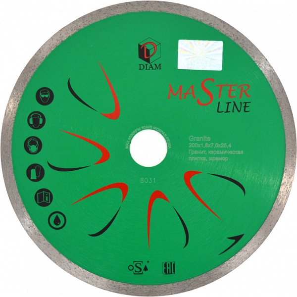 Алмазный отрезной круг Diam Master Line 1A1R Корона Granite 200 мм (Диам Мастер Лайн 1А1Р Корона Гранит 200 мм) – универсальный недорогой алмазный диск высокого качества со сплошной режущей кромкой для резки гранитной, мраморной и керамической плитки болгарками (ушм), штроборезами и плиткорезами электрическими с подачей воды.
