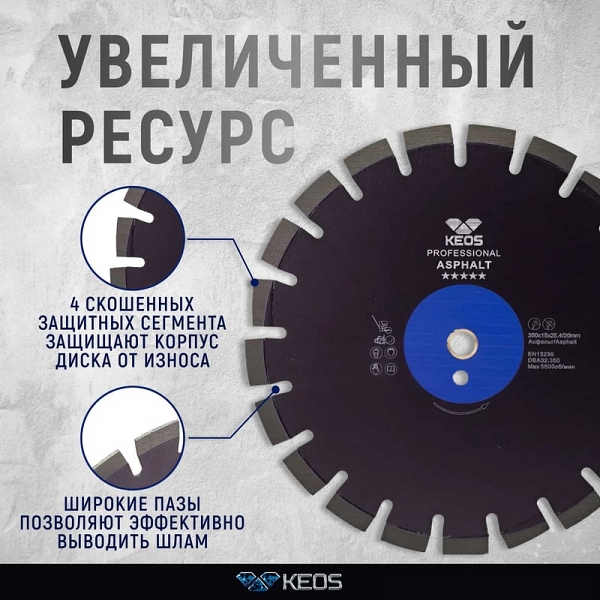Цена и технические характеристики диска алмазного сегментного по асфальту Keos Professional Asphalt 450 мм: