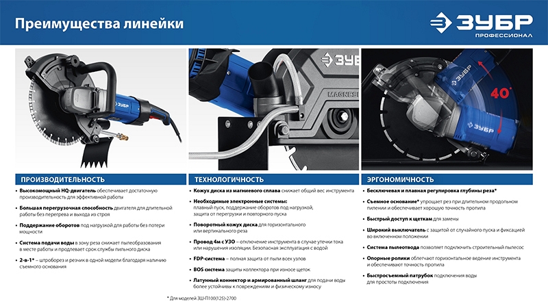 Преимущества электрического резчика по бетону Зубр Профессионал ЗШ-П120-2700 ПСТ: