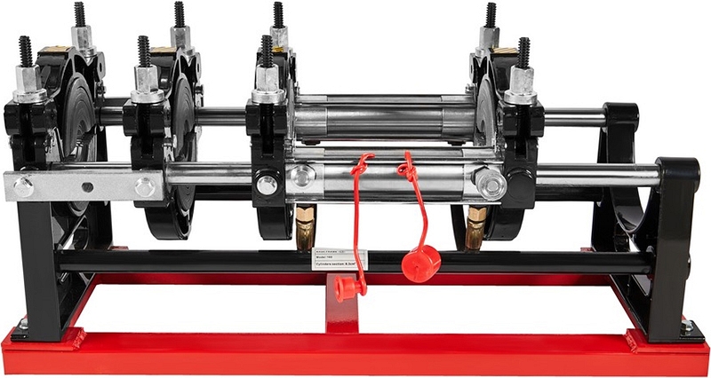 - Центраторо с гидравлическим приводом и 4-мя прочными широкими зажимами, один из которых легко может быть удален для облегчения сварки полимерных фитингов с трубами (тройники, крестовины, отводы), имеет большой запас прочности за счет качественного сплава и ребер жесткости, что позволяет сваривать полимерные трубы с любым показателем SDR