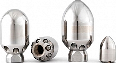 - Изготовлены из особо износостойкой, не поддающейся коррозионному воздействию, закаленной, нержавеющей стали с использованием оптимизированной системы "3D Гидромеханикс": насадки для очистки канализационных сетей были разработаны с использованием оптимизированного "3D Гидромеханизма" – вода, выходящая из шланга высокого давления, плавно поворачивается на 180º, поступает во внутреннюю полость насадки и направляется непосредственно в керамические сопла по пяти осевым каналам (отшлифованных и с высокой точностью обработанных на станке типа CNC), а не трубок или желобов
