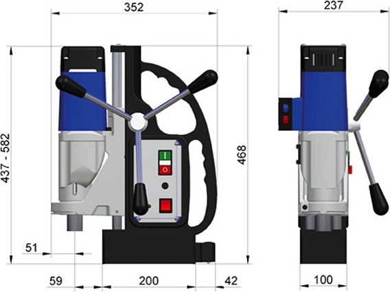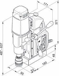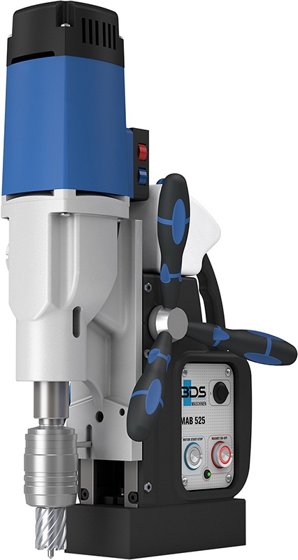 Магнитный сверлильный станок BDS MAB 525 (БДС МАБ 525) на магнитном основании предназначен для сверления сквозных отверстий Ø 12 – 60 мм корончатыми сверлами, Ø до 20 мм спиральными сверлами, расширения до Ø 25 мм, зенкования до Ø 50 мм, нарезания резьбы до М20.