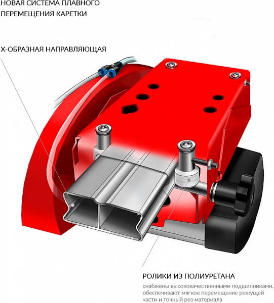 - Новая конструкция направляющей и каретки на роликах из полиуретана, снабженных высококачественными подшипниками, обеспечивает мягкое перемещение режущей части и точный рез материала