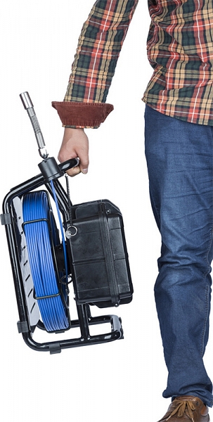 - Проталкиваемый кабель Ø 5,2 мм × 20 м из стекловолокна со встроенным счетчиком расстояния намотан на барабан из нержавейки