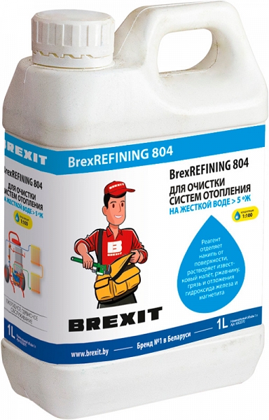 Реагент для промывки системы отопления Brexit BrexRefining 804 (Брекзит БрекзРифайнинг 804) – органический щелочной коррозионно не активный реагент, разработанный для удаления окислов металлов, минеральных отложений и шлама, профессиональное химическое средство для очистки инженерных систем, контура теплого пола с показателем жесткости воды > 5°Ж от накипи, ржавчины, известкового налета, отложений магнетита и гидроксида железа и грязи; восстановления теплообмена и нормальной работы сильно загрязненных систем отопления, сервисное обслуживание которых не проводилось более 3 лет.
