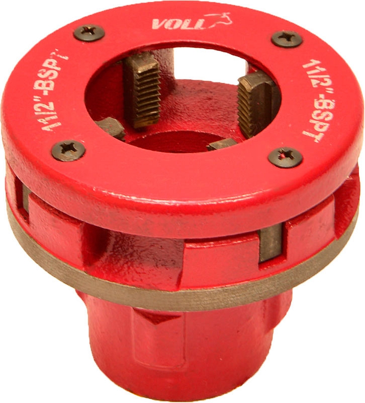 Резьбонарезная головка для ручного клуппа Voll BSPT R SS 1 1/2" (Волл БСПТ Р СС 1 1/2") предназначена для нарезания правой трубной конической резьбы BSPT R на стальных водо- и газопроводных трубах Ø 1 1/2". Идеально подходит для использования в ручных резьбонарезных клуппах Voll, с использованием смазочно-охлаждающей жидкости Voll. Может использоваться с электрическими и ручными клуппами некоторых других производителей (совместимость уточняйте у специалистов).