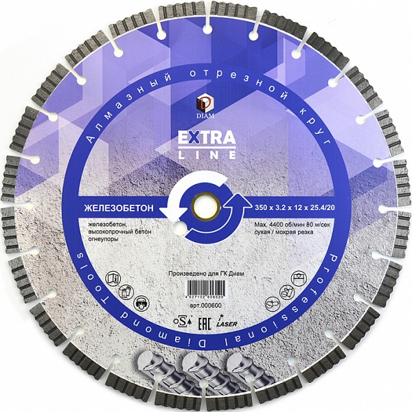 Сегментный алмазный круг Diam Extra Line 1A1RSS Turbo Железобетон 350 мм (Диам Экстра Лайн 1А1РСС Турбо Железобетон 350 мм) – профессиональный алмазный отрезной диск с лазерной сваркой сегментов для сухой и мокрой резки железобетона, старого высокопрочного бетона, клинкера, огнеупоров и других твердых материалов на бензорезах, электрических резчиках, камнерезных станках, стенорезных машинах, швонарезчиках, как с водяным охлаждением, так и без.