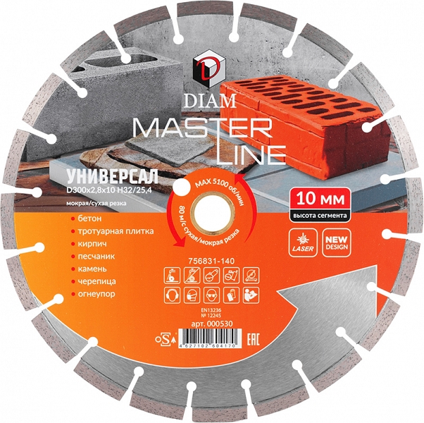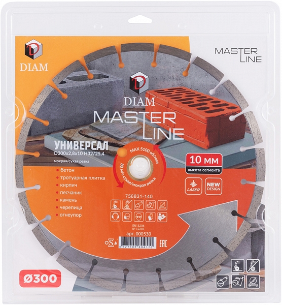 Сегментный алмазный круг Diam Master Line 1A1RSS Универсал 300 мм (Диам Мастер Лайн 1А1РСС Универсал 300 мм) – специальный алмазный отрезной диск с лазерной сваркой сегментов для сухой и мокрой резки бетона, тротуарной плитки, кирпича, черепицы, песчаника, природного и искусственного камня, строительных материалов общего назначения на системах резки крупноформатной плитки, бензорезах, электрических резчиках и плиткорезах, камнерезных станках, стенорезных машинах, швонарезчиках, с подачей и без подачи воды.