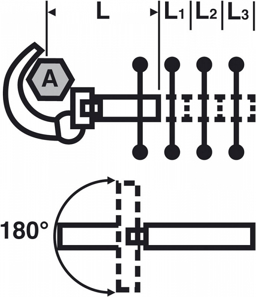 - Угол поворота 180° с фиксацией и перемещением губок, закрепленных на конце рукоятки