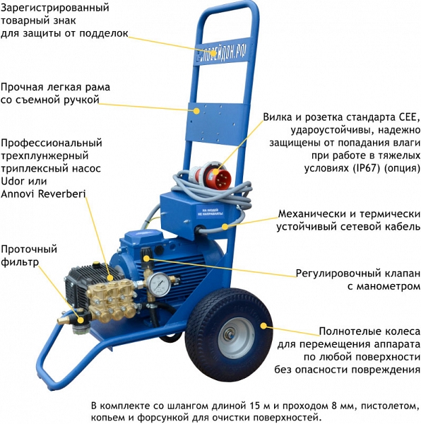 – Вилка и розетка стандарта CEE, удароустойчивы, надежно защищены от попадания влаги при работе в тяжелых условиях IP 67 (дополнительная опция) - Профессиональный надежный трехплунжерный насос высокого давления с керамическими плунжерами Annovi Reverberi (Италия) или Interpump (Италия):